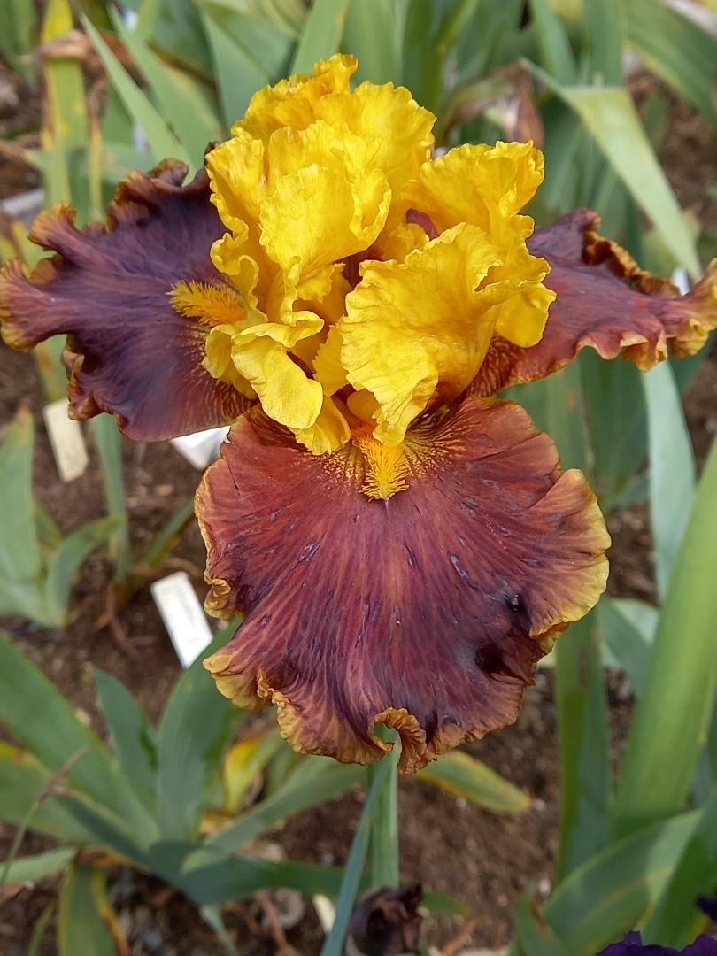 Early midseason to midseason bloom. Standards and style arms yellow, slight midline rose blush; falls streaky red-brown, brown underside, narrow brown edging; ruffled; beards orange; slight spicy fragrance.