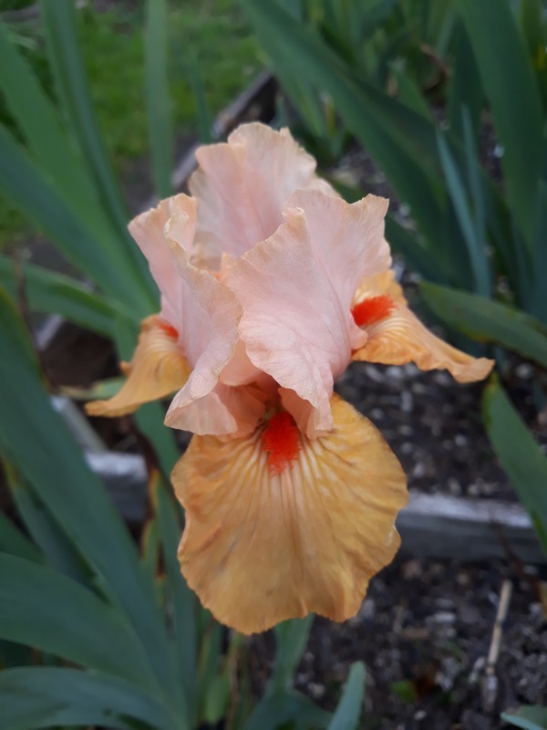 Early through midseason bloom. Standards medium pink; falls orange apricot; beards bright saturn red; sweet fragrance.