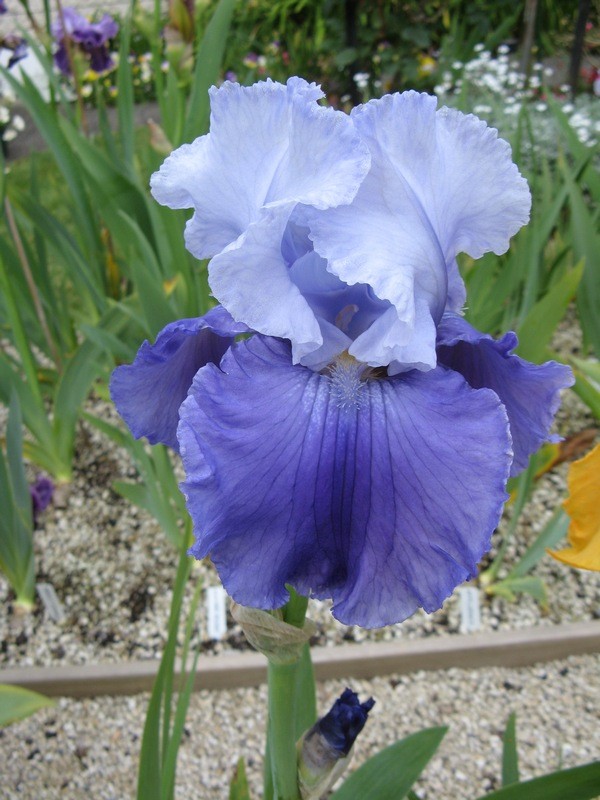 Standards white; Falls smooth medium true blue; heavily ruffled.