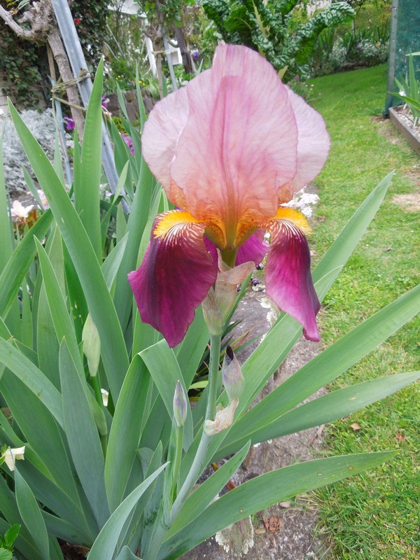 Strong reddish overtones on yellow. Falls deep red. Excellent grower. This is the first iris I ever grew.